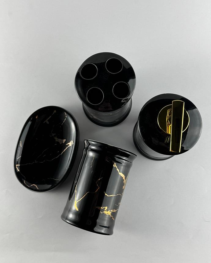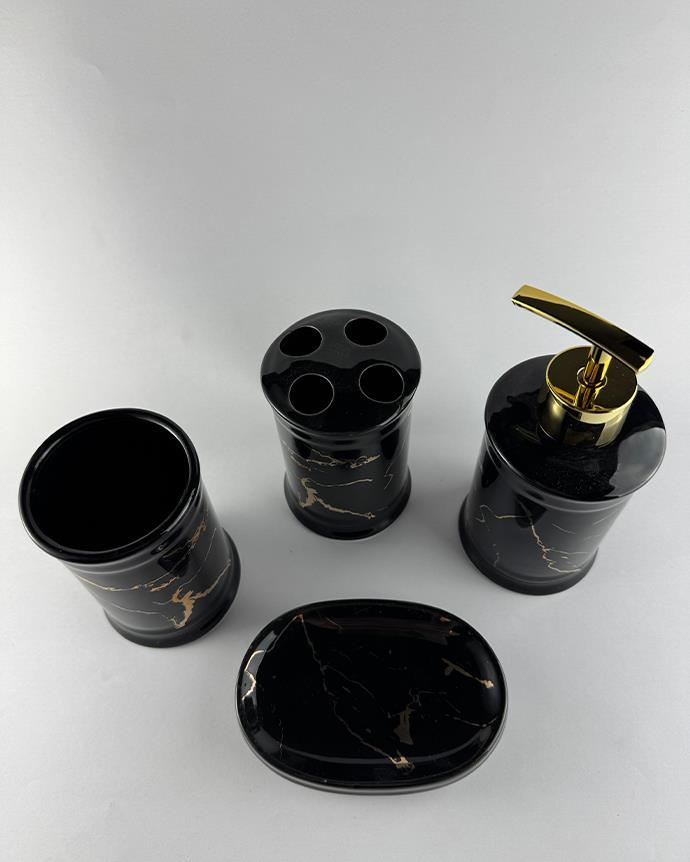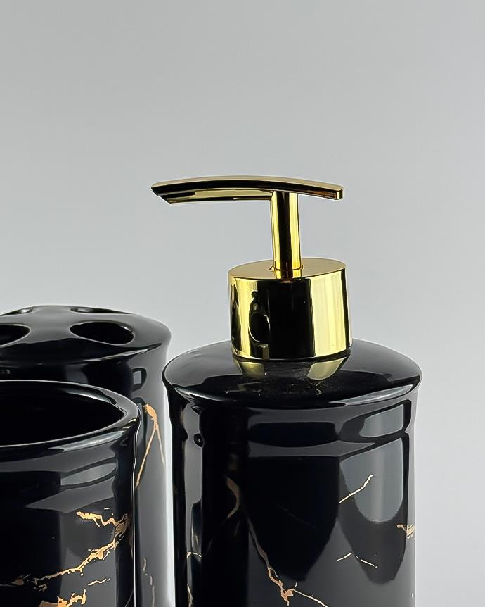 Ürünün üzerinde gold desenler bulunmaktadır. Ürün rengi: Siyahtır. Sıvı sabunluk pompası rengi: gold.