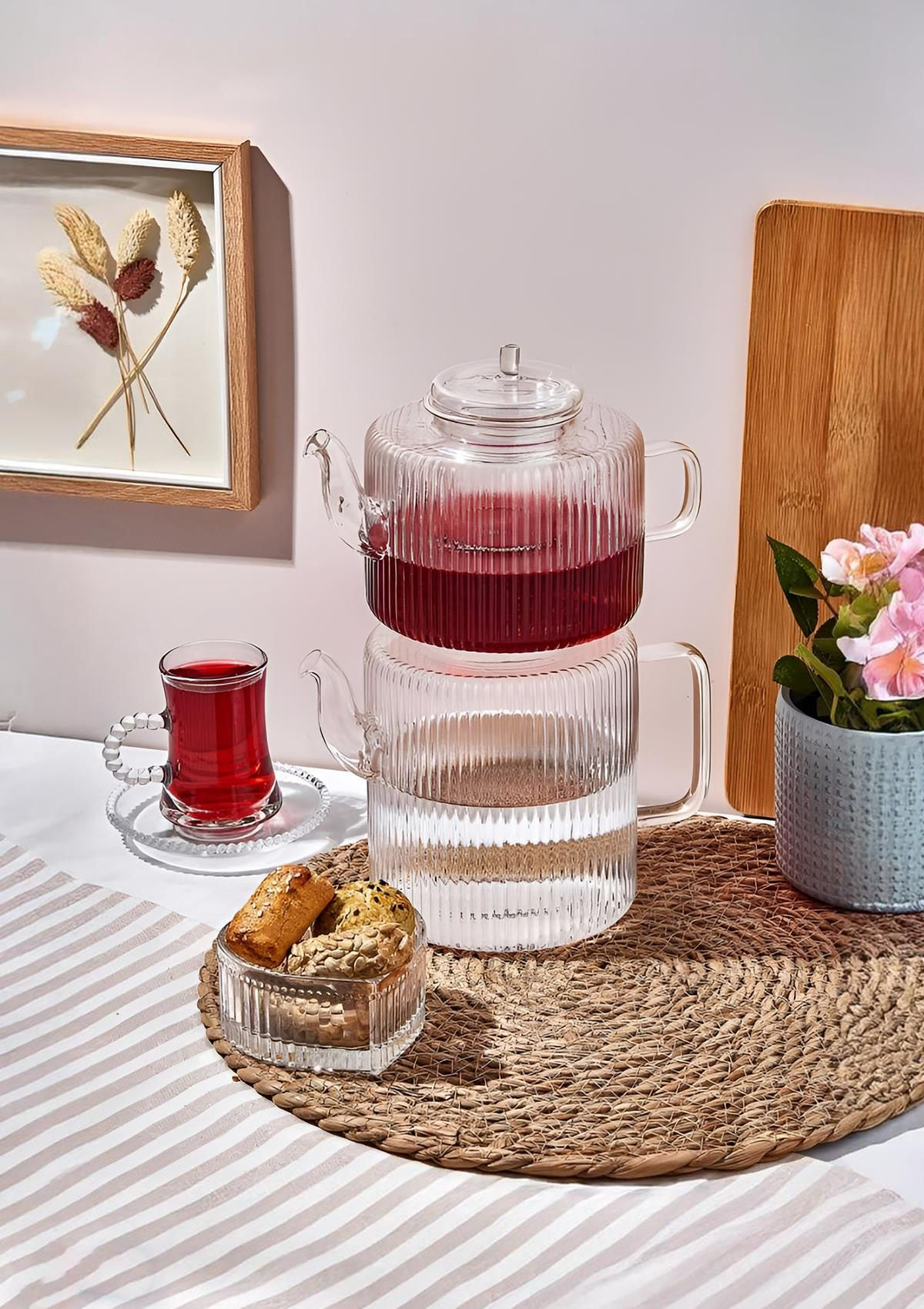 Borosilikat Cam Çaydanlık Seti - Çizgili Çaydanlık Takımı - Orta Boy - Ateşe Dayanıklı (HOME-16800)