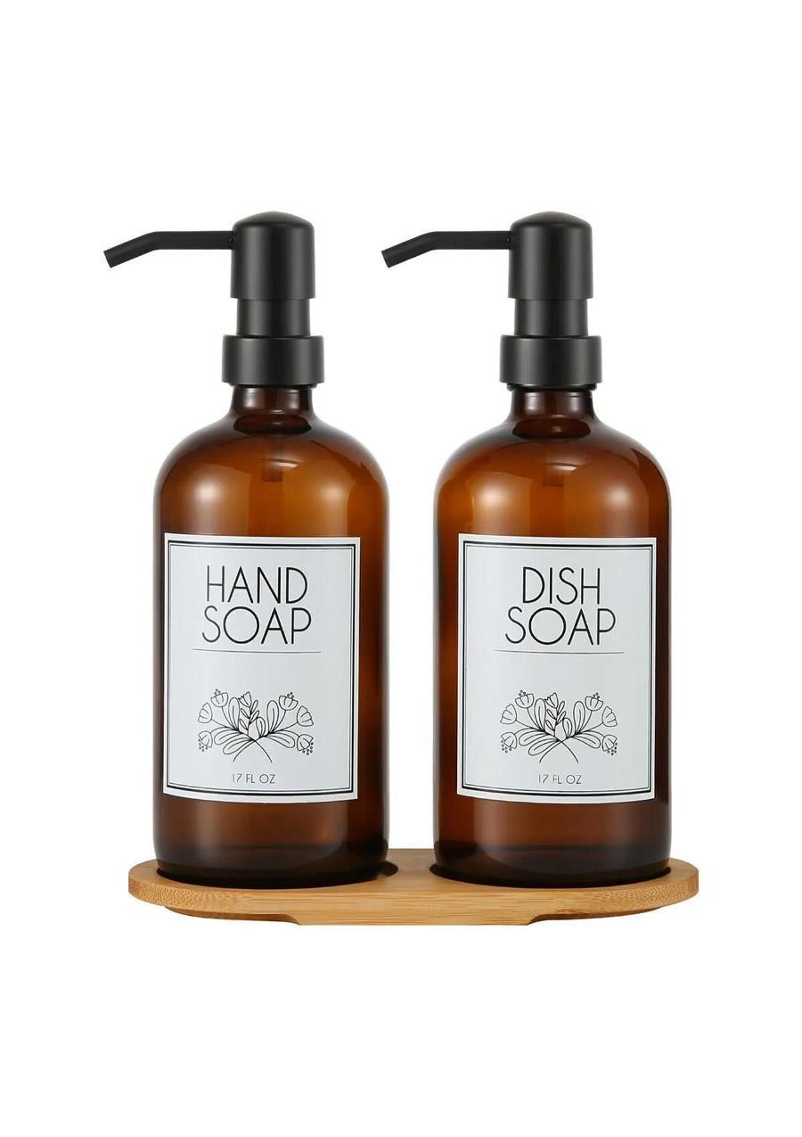 Lozione 2’li Mutfak Sıvı Sabunluk Seti - Bambu Stantlı Sıvı Sabunluk Takımı - 2x500 ML, Siyah Amber