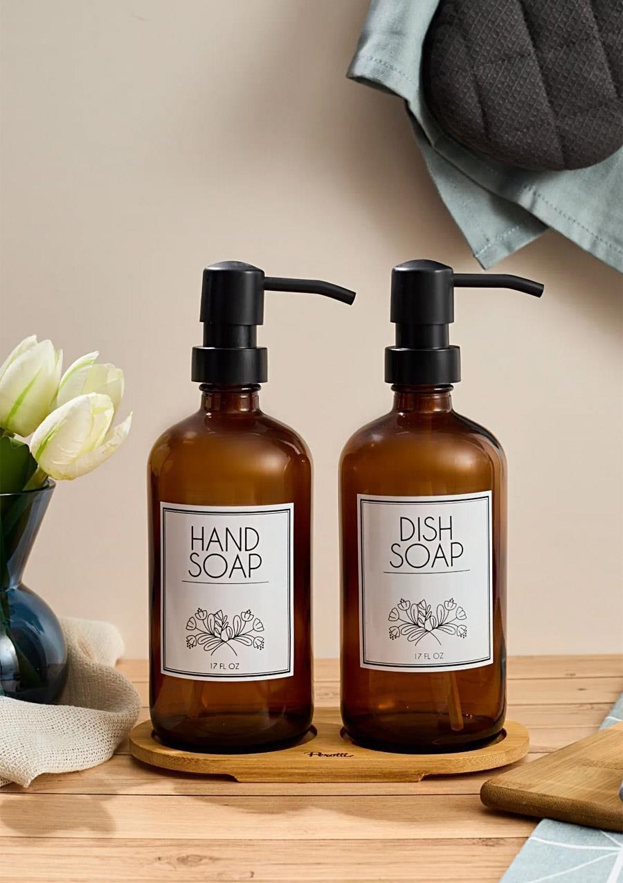 Lozione 2’li Mutfak Sıvı Sabunluk Seti - Bambu Stantlı - 2x500 ML, Siyah Amber