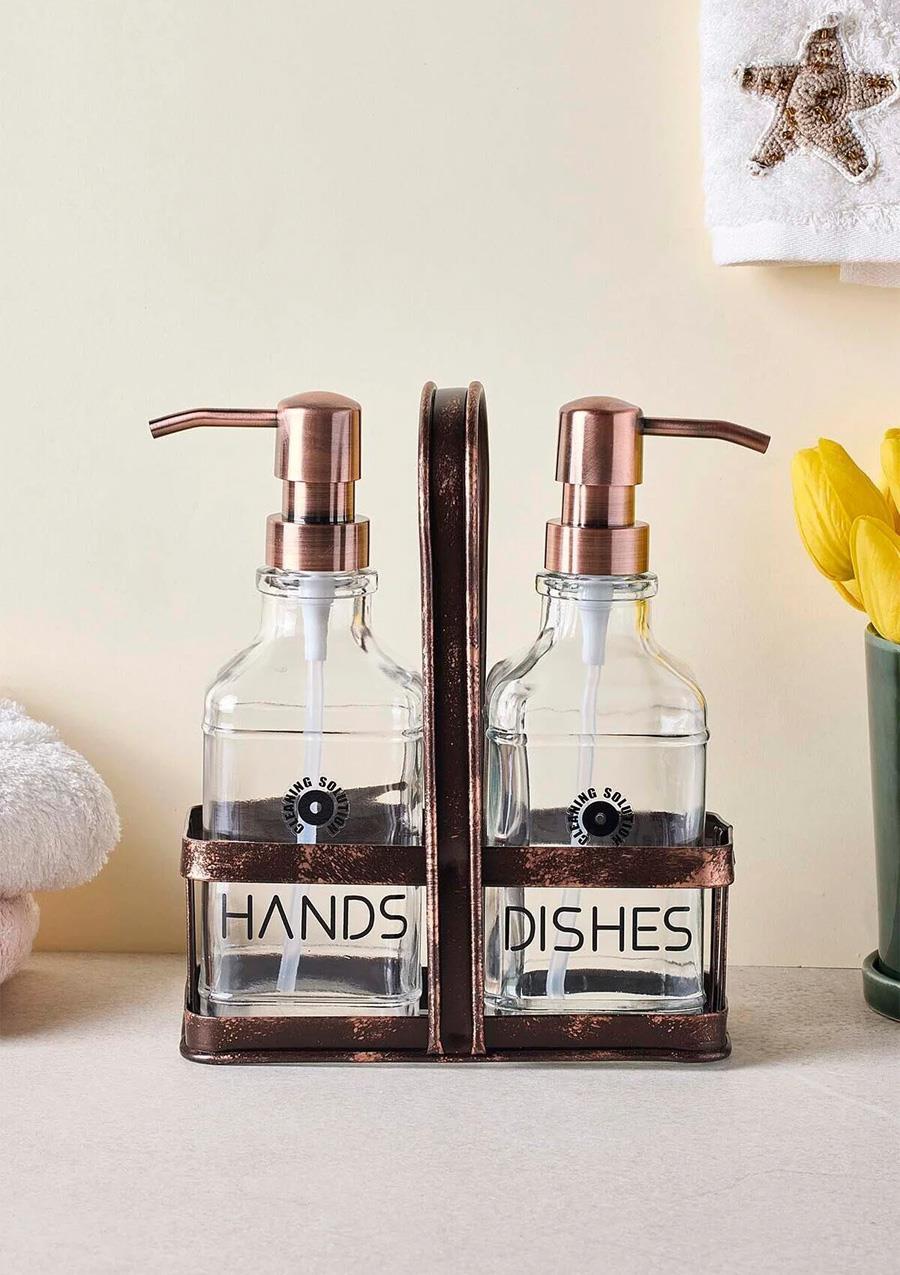 Rame Sıvı Sabunluk Seti - 2x500 ML Kare, şeffaf cam şişeleri ve eskitme metal standıyla mutfak ve banyolarınıza nostaljik bir zarafet katar. Hem düzenli hem de dekoratif bir kullanım sunar.