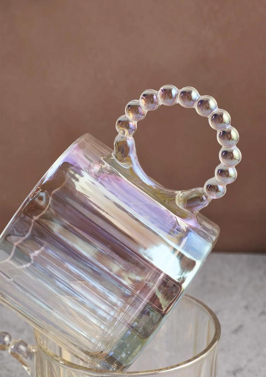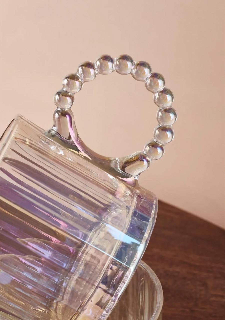 Şeffaf renkli luster efektli cam yüzeyi ile ışığı yansıtarak farklı açılardan göz alıcı bir görünüm sunar. Boncuklu kulp tasarımı ise ergonomik ve şık bir tutuş sağlar.