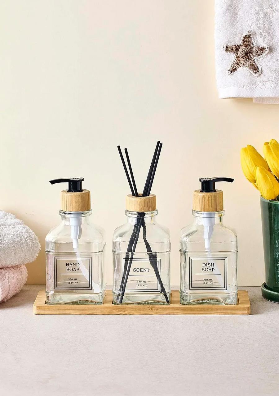 • Tasarım: Şeffaf cam şişeler, bambu kapak ve başlık