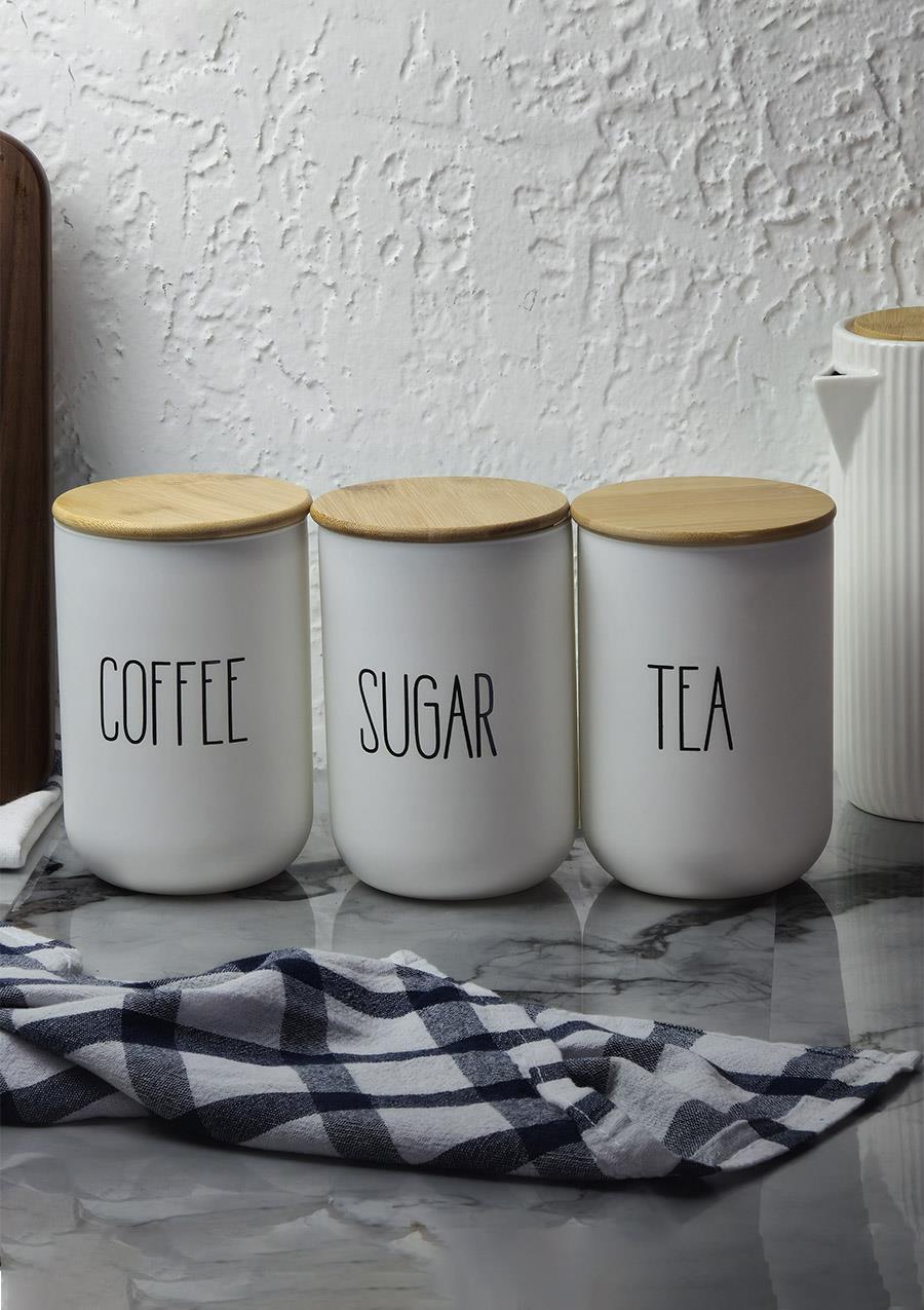 Set içerisindeki 3 kavanozun üzerinde İngilizce olarak sırasıyla "Sugar" (Şeker), "Coffee" (Kahve) ve "Tea" (Çay) yazıları yer alır. Bu sayede mutfağınızda stil sahibi bir görünüm elde ederken, malzemelerinizi düzenli bir şekilde saklayabilirsiniz.