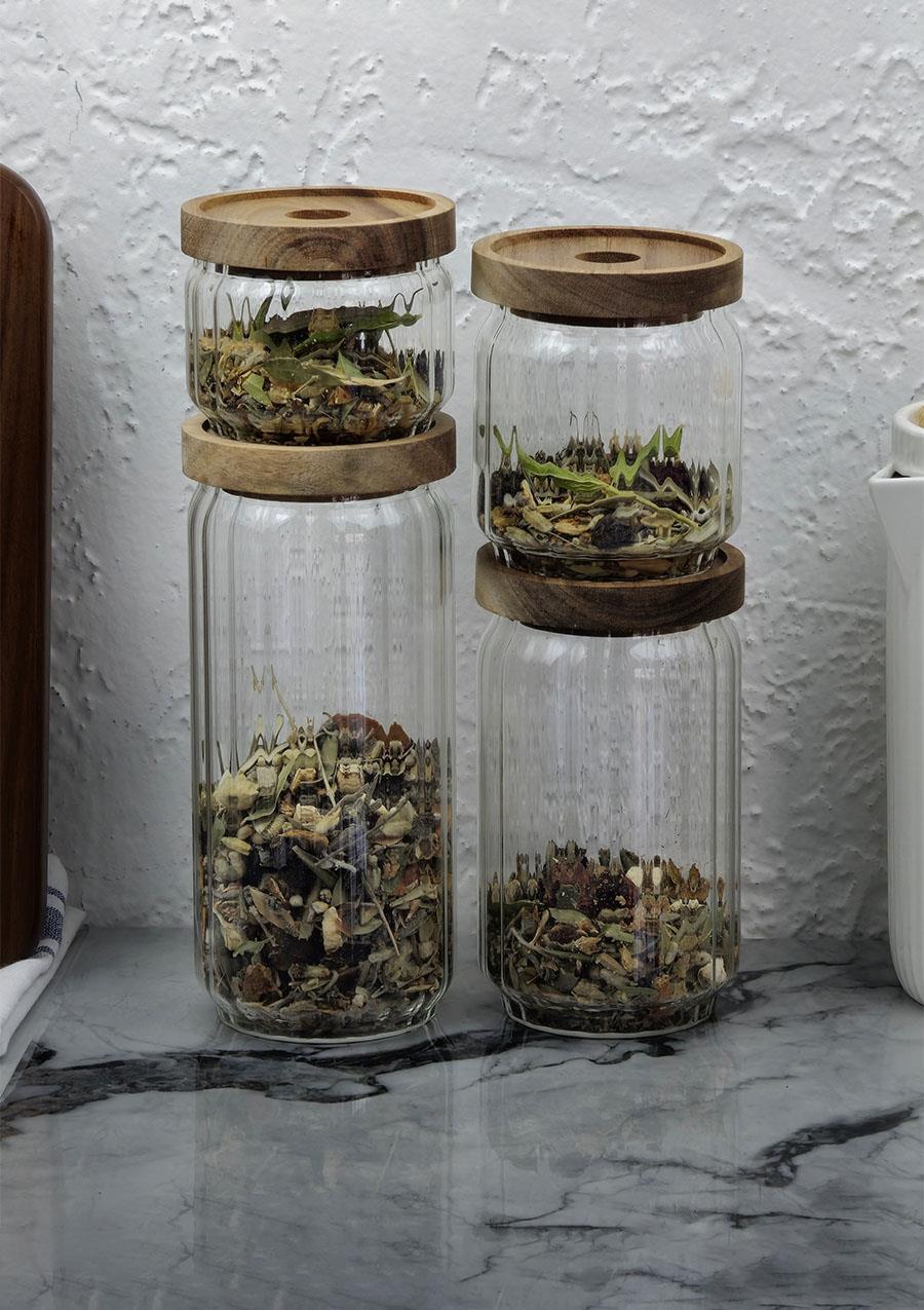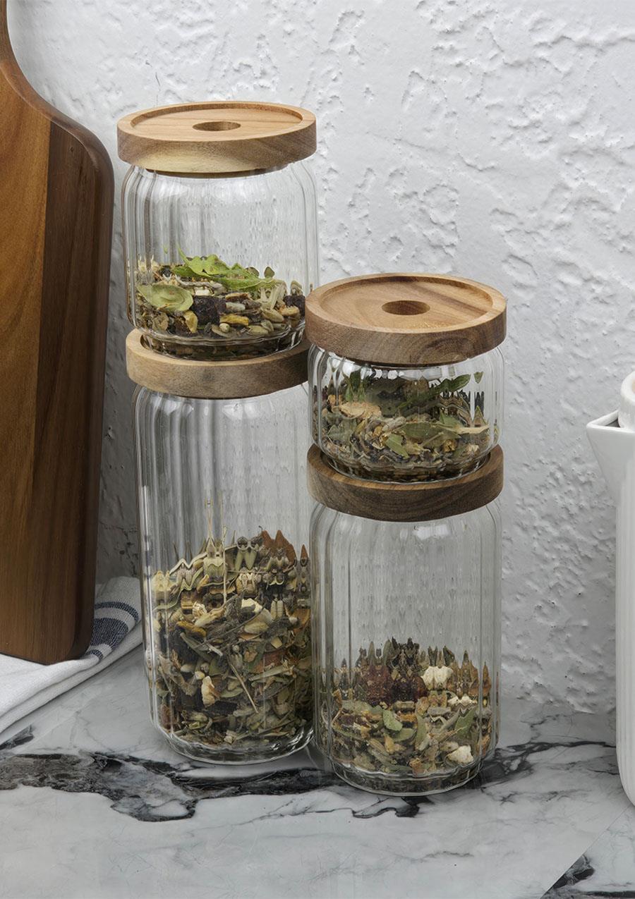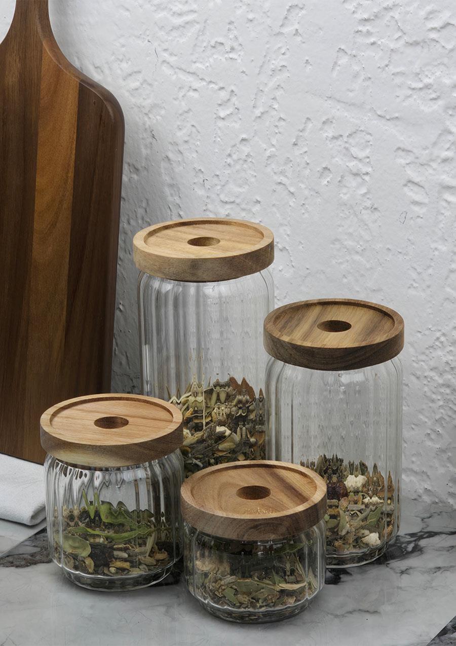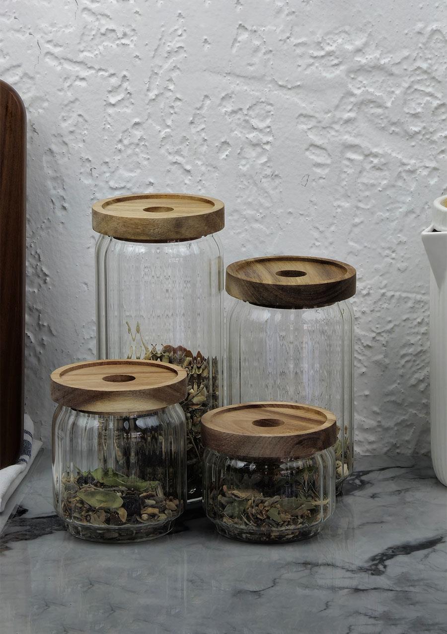 Timber Cam Kavanoz Seti - Çizgili 4'lü Saklama Kavanozu Takımı - Ahşap Kapaklı, 8 Parça